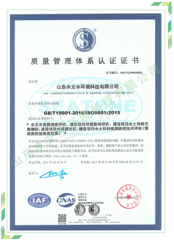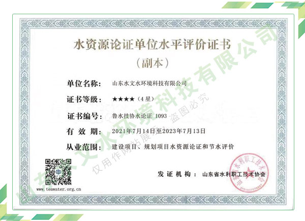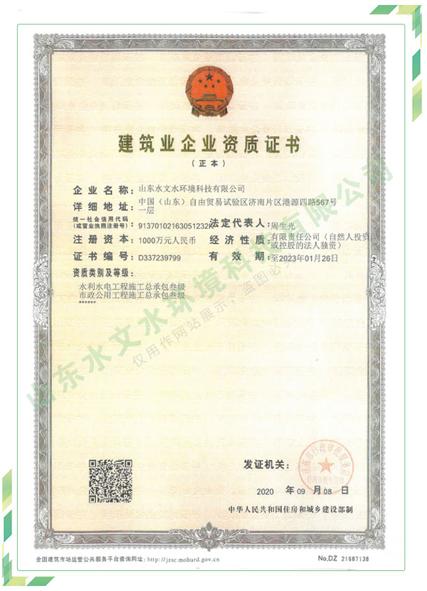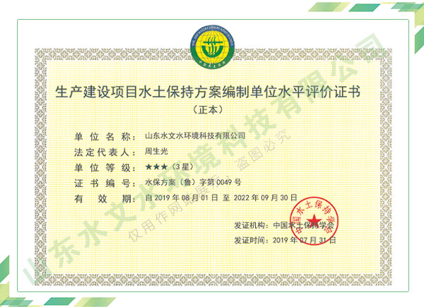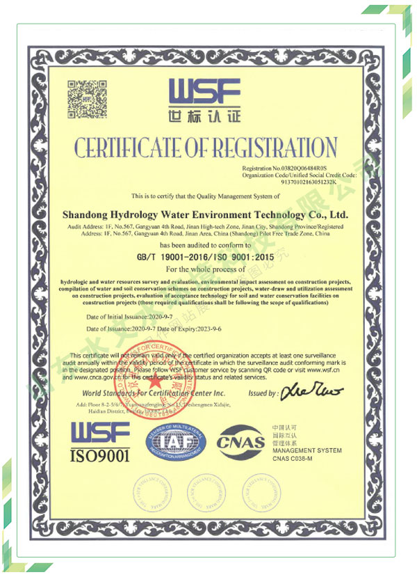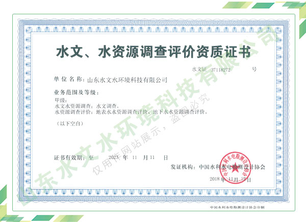 公司擁有水利工程設計、水土保持、水文水資源調(diào)查評價、水資源論證、建設項目環(huán)境影響評價、市政公用工程施工總承包、水利水電工程施工總承包、電子與智能化工程專業(yè)承包等資質(zhì),2017年通過質(zhì)量管理體系、環(huán)境管理體系、職業(yè)健康安全管理體系認證;2020年被評為國家級高新技術(shù)企業(yè),同年被中國水利企業(yè)協(xié)會推薦為第一批“合同節(jié)水服務企業(yè)”;2021年被山東省、濟南市評為 “專精特新”中小企業(yè)。業(yè)務范圍涉及水利工程設計;節(jié)水設計、改造、水平衡測試;山洪災害調(diào)查;城市水資源調(diào)查評價;建設項目水土保持方案編制、監(jiān)測、驗收、水土保持規(guī)劃;水安全保障規(guī)劃、建設項目水資源論證、規(guī)劃水資源論證;建設項目環(huán)境影響評價;入河排污口論證;防洪影響評價;市政公用工程施工、水利水電工程施工、電子與智能化工程施工等。